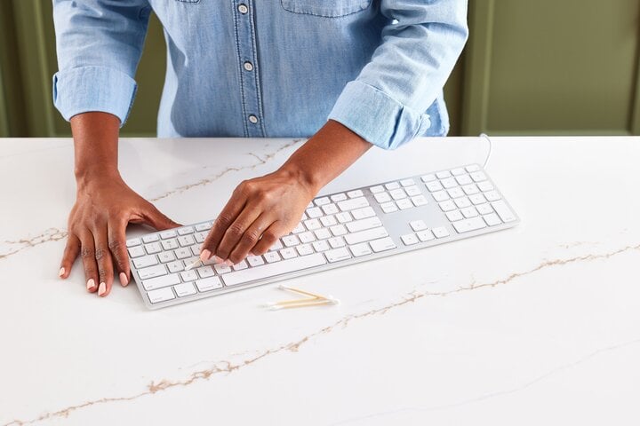 Điện thoại di động, bàn phím và các thiết bị điện tử khác thường chứa nhiều vi khuẩn do tiếp xúc thường xuyên. Hãy áp dụng mẹo làm sạch bằng cồn để xử lý. Trước tiên, bạn cần tắt thiết bị, thấm một ít cồn vào bông gòn hoặc khăn mềm rồi lau nhẹ nhàng bề mặt thiết bị. Tuyệt đối không để cồn thấm vào các khe, cổng kết nối của thiết bị, tránh gây hư hỏng.